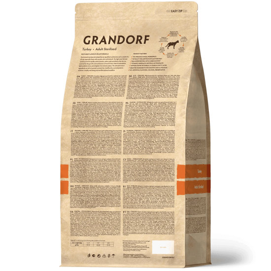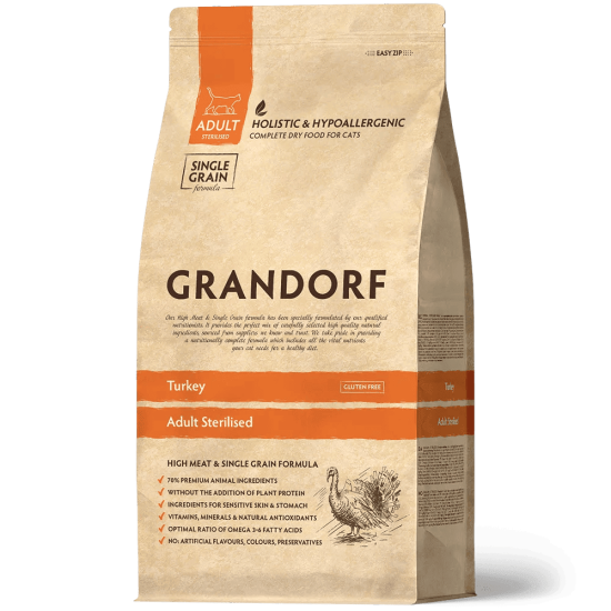 Grandorf Cat Turkey Adult Sterilized is specially developed for spayed, neutered, and senior cats aged 1 year and older with sensitive or allergy-prone digestions. The formula contains 70% high-quality turkey, without bones or offal, and provides all essential amino acids. With only one animal protein source—brown rice as a carbohydrate—and a short ingredient list, the food is easily digestible, hypoallergenic, and wheat gluten-free. The low fat and high protein content, plus L-carnitine, help maintain weight and muscle mass. Natural prebiotics such as chicory root support intestinal flora, improve nutrient absorption, and strengthen the immune system. Taurine contributes to a healthy heart and sharp eyesight, while omega-3 and -6 fatty acids promote healthy skin and a shiny coat. Grandorf is free from corn, wheat, beets, peas, offal, eggs, chicken, chicken fat, salt, sugar, artificial colors and flavors, soy, and GMOs.